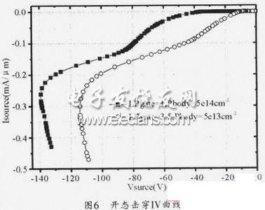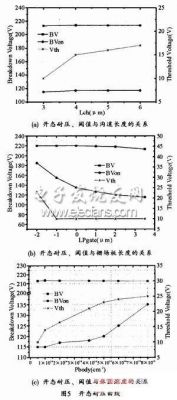 針對nLDMOS器件開態耐壓低的問題,有針對性地仿真了溝道長度、多晶硅柵場板長度及體區濃度對開態耐壓的影響。圖5(a)為nLDMOS的關態耐壓、開態耐壓及閾值與溝道長度(Lch)的關系。可以看出溝道長度對器件的開態耐壓和關態耐壓影響很小。閾值隨著溝道長度的增加而增加,這是由于采用橫向雙擴散形成溝道,所以隨著溝道長度增加,p型體區的濃度越來越大,閾值也就越來越大。圖5(b)為nLDMOS的關態耐壓、開態耐壓及閾值與多晶硅柵極場板長度(LPgate)的關系。在柵極場板較長時,其對閾值和關態耐壓影響很小,當柵極場板縮短到多晶硅柵不能覆蓋溝道時,器件的開態耐壓大幅增加。這時閾值也迅速增加。雖然多晶硅柵不能完全覆蓋溝道,但是由于開態時nLDMOS的柵漏電壓差很大,所以仍然能夠在表面形成反型層溝道。因此,大幅減短柵極場板能有效提高器件的開態耐壓,但是同時也帶來了器件不能有效開啟的問題。圖5(c)為nLDMOS的關態耐壓、開態耐壓及閾值與體區注入劑量(Pbody)的關系。可以看出增加體區的注入劑量對器件的耐壓影響很小。但是隨著注入劑量的增加,體區濃度增加,所以閾值就增加,同時器件的開態耐壓也隨之增加。當體區注入劑量達到5e14cm-2時,閾值增加緩慢,開態耐壓卻大幅增加,所以只能通過閾值上的犧牲來改善nLDMOS的開態擊穿耐壓。