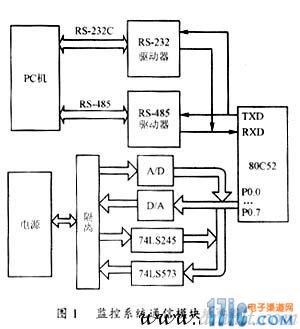 為了組建開關(guān)電源監(jiān)控系統(tǒng),系統(tǒng)中的每臺(tái)電源配置了一個(gè)獨(dú)立的監(jiān)控系統(tǒng)通信模塊。監(jiān)控系統(tǒng)通信模塊采用的控制芯片是MCS51系列單片機(jī)80C52。80C52具有8k的內(nèi)部ROM和256字節(jié)的內(nèi)部RAM。監(jiān)控系統(tǒng)通信模塊電路結(jié)構(gòu)圖如圖1所示。計(jì)算機(jī)通過(guò)該通信模塊可以實(shí)時(shí)讀取電源的輸出電壓、輸出電流值以及輸出過(guò)壓、輸入過(guò)壓、輸入欠壓、過(guò)流、過(guò)熱、運(yùn)行/停止等8路開關(guān)量的狀態(tài)值,并可以在輸出值允許的范圍內(nèi)任意設(shè)置電源的輸出電壓、輸出電流值和復(fù)位、合閘、分閘、機(jī)控/本控4路開關(guān)量的狀態(tài)值。從監(jiān)控系統(tǒng)通信模塊電路結(jié)構(gòu)示意圖可以看出,如果計(jì)算機(jī)需要讀取電源模塊的輸出電壓、輸出電流值和開關(guān)量的狀態(tài)時(shí),單片機(jī)收到請(qǐng)求命令后啟動(dòng)A/D轉(zhuǎn)換芯片MAX182對(duì)電源的輸出電壓、輸出電流兩路模擬量進(jìn)行轉(zhuǎn)換,轉(zhuǎn)換后的數(shù)據(jù)送入單片機(jī)進(jìn)行數(shù)據(jù)處理。同時(shí)表征電源運(yùn)行狀態(tài)的8路開關(guān)量從雙總線收發(fā)器74LS245讀入送至單片機(jī)寄存器存貯。單片機(jī)將所有處理后的數(shù)據(jù)按預(yù)定數(shù)據(jù)傳送格式發(fā)送給計(jì)算機(jī)輸出顯示。計(jì)算機(jī)需要設(shè)置電源的輸出電壓、輸出電流值和4路開關(guān)量的狀態(tài)時(shí),計(jì)算機(jī)將設(shè)置好的數(shù)據(jù)按預(yù)定格式發(fā)送給單片機(jī)。單片機(jī)接收處理后啟動(dòng)D/A轉(zhuǎn)換芯片MAX532和輸出鎖存器74LS573將處理后的輸出電壓、輸出電流值和開關(guān)量狀態(tài)值輸出給電源。監(jiān)控系統(tǒng)通信模塊從而實(shí)現(xiàn)了計(jì)算機(jī)對(duì)電源的實(shí)時(shí)監(jiān)控。為了保證設(shè)計(jì)人員的安全和防止通信模塊受電源影響而損壞,電源與通信模塊之間的信號(hào)傳遞均通過(guò)光耦隔離。