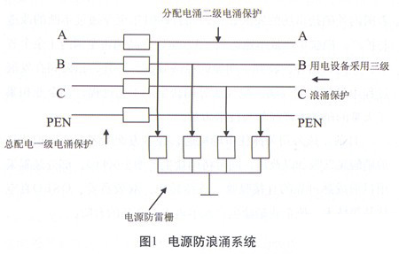 智能儀表控制系統的電源是從配電系統進入計算機主控室。電源系統是從發電廠通過變壓器、配電系統最后供儀表系統使用,在雷暴天氣中電源輸送進由于環韋多途徑長,極可能遭受雷擊,因此此時的電源并不是380v或220v、50Hz交流電,而是參雜了各種雜波的浪涌電壓,如果不設置防浪涌保護系統,那么使用中的電器設備會因超過耐壓極限而發生事故。將總配電進來的A、B、C、D三線四相并接至電源浪涌器所相對的A、B、C、D接線柱上。在雷暴時感應雷浪涌通過電涌保護器保護將過載電流匯入大地,輸出電壓鉗制在安全工作區內,確保電源安全運行。電源防浪涌系統如圖1所示。