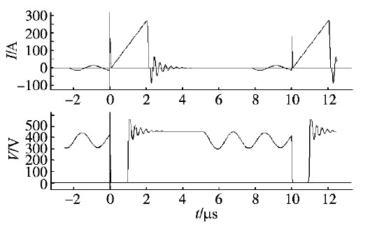 文獻基本都是用梯形波來表示噪聲源的,但實際中并不是每個電路中的開關器件的波形都能很好地用梯形波近似,圖3所示即為一個反激電源開關管的電流電壓波形,除了梯形波之外,還有電流尖峰,電壓過沖和下沖等分量,會導致噪聲源的頻譜與梯形波有一定的不同。所以不能盲目地使用梯形波來表征噪聲源,而是需要對電路進行分析或者仿真,從而得到開關器件的電流或電壓波形,基于此波形再對噪聲源進行建模,這樣才能更精確地反映開關電源的電磁干擾。