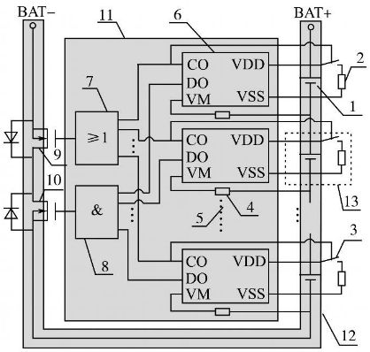 采用單節(jié)鋰電池保護(hù)芯片設(shè)計(jì)的具備均衡充電能力的鋰電池組保護(hù)板示意圖如圖1所示。其中:1為單節(jié)鋰離子電池;2為充電過電壓分流放電支路電阻;3為分流放電支路控制用開關(guān)器件;4為過流檢測保護(hù)電阻;5為省略的鋰電池保護(hù)芯片及電路連接部分;6為單節(jié)鋰電池保護(hù)芯片(一般包括充電控制引腳CO,放電控制引腳DO,放電過電流及短路檢測引腳VM,電池正端VDD,電池負(fù)端VSS等);7為充電過電壓保護(hù)信號(hào)經(jīng)光耦隔離后形成并聯(lián)關(guān)系驅(qū)動(dòng)主電路中充電控制用MOS管柵極;8為放電欠電壓、過流、短路保護(hù)信號(hào)經(jīng)光耦隔離后形成串聯(lián)關(guān)系驅(qū)動(dòng)主電路中放電控制用MOS管柵極;9為充電控制開關(guān)器件;10為放電控制開關(guān)器件;11為控制電路;12為主電路;13為分流放電支路。單節(jié)鋰電池保護(hù)芯片數(shù)目依據(jù)鋰電池組電池?cái)?shù)目確定,串聯(lián)使用,分別對所對應(yīng)單節(jié)鋰電池的充放電、過流、短路狀態(tài)進(jìn)行保護(hù)。該系統(tǒng)在充電保護(hù)的同時(shí),通過保護(hù)芯片控制分流放電支路開關(guān)器件的通斷實(shí)現(xiàn)均衡充電,該方案有別于傳統(tǒng)的在充電器端實(shí)現(xiàn)均衡充電的做法,降低了鋰電池組充電器設(shè)計(jì)應(yīng)用的成本。