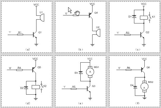 選用NPN 型、還是PNP 型晶體管驅(qū)動負載,要看設計者的要求。如圖1(a)、(c)、(e)是使用NPN 型晶體管驅(qū)動負載的電路,高電平“1”可以控制晶體管導通(負載通電)、低電平“0”使晶體管截止(負載斷電)。而圖1(b)、(d)、(f)是使用PNP 型晶體管驅(qū)動負載的電路,導通條件剛好相反。