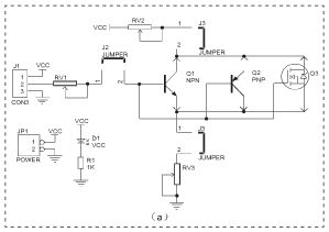我們制作了晶體管的測試電路板,分別對NPN 型晶體管2N5551、PNP 型晶體管2N5401 驅(qū)動電路中相同負載的不同接法做了實物測試。圖4(a)是晶體管測試電路板的原理圖,將圖4(a)左邊J1 的1、2 引腳短接,可以測試NPN 型晶體管負載驅(qū)動電路;將J1的2、3引腳短接,可以測試PNP型晶體管負載驅(qū)動電路。