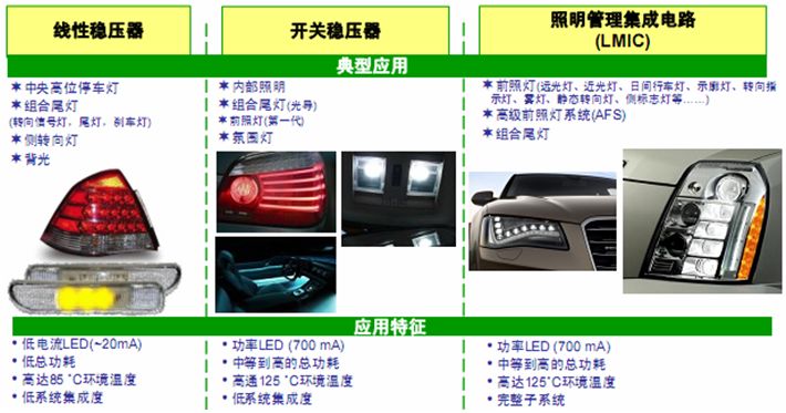 驅(qū)動LED的開關(guān)穩(wěn)壓器的能效一般介于50%至90%之間,涉及降壓、升壓及降壓-升壓等不同拓?fù)浣Y(jié)構(gòu),講究EMI控制方法,主要用于汽車內(nèi)部照明、停車燈、霧燈、日間行車燈及側(cè)面標(biāo)志燈等應(yīng)用。