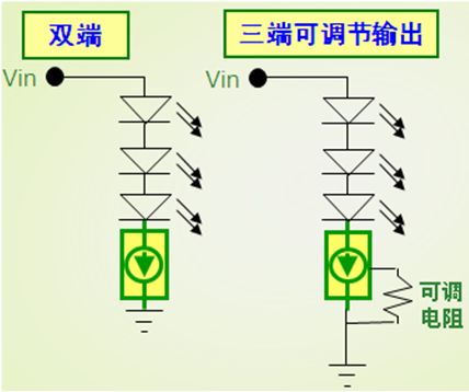 適合低電流LED應(yīng)用的CCR,可以采用安森美半導(dǎo)體運(yùn)用專利自偏置晶體管(SBT)技術(shù)開發(fā)出來得NSI45系列。這系列CCR包含雙端固定輸出和三端可調(diào)節(jié)輸出兩種類型,電流等級涵蓋10至180 mA,雙端及三端CCR電路圖如圖2所示。其中三端可調(diào)節(jié)輸出CCR包括電流30至80 mA(SOT-223)及60至150 mA(DPAK)等不同選擇,能夠用于滿足特定電流設(shè)置要求。