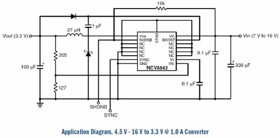 在降壓開關(guān)驅(qū)動器方面,包括NCV8842、NCV8843及NCV51411等產(chǎn)品,適合于車身/遠(yuǎn)程信息系統(tǒng)等應(yīng)用。NCV8842/3是帶同步功能的1.5 A、170/340 kHz降壓驅(qū)動器,支持4.5 V至40 V輸入電壓,而輸出電壓可從1.27 V開始編程設(shè)定。同步引腳功能用于改善EMI性能。