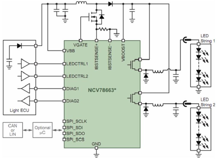 一般而言,汽車前照燈要求支持從單個LED到多串LED,電壓可高達(dá)60 V;此外,還要求支持脈寬調(diào)制(PWM)調(diào)光(如用于示廓燈)、高集成度、高能效、LED串低電磁輻射、集成診斷及通信接口等。安森美半導(dǎo)體針對LED汽車前照燈系統(tǒng)開發(fā)了NCV78663電源鎮(zhèn)流器及雙LED驅(qū)動器。NCV78663是先進(jìn)的高可靠性、高能效的系統(tǒng)級芯片(SoC) LED驅(qū)動器,支持達(dá)2 A電流,提供高于90%的總能效,驅(qū)動高達(dá)60 V電壓的多串LED,能以PWM調(diào)光維持色溫及控制平均電流,使設(shè)計(jì)人員能夠以一顆高集成度的SoC控制遠(yuǎn)光燈及近光燈、日間行車燈、轉(zhuǎn)向指示燈及霧燈,所需外部元件極少。這器件通過SPI接口與外部微控制器通信,在上電后動態(tài)地控制系統(tǒng)參數(shù)、檢測LED工作狀態(tài)并反饋診斷信息。圖8顯示的是NCV78663在先進(jìn)的汽車前照燈應(yīng)用中的電路圖。