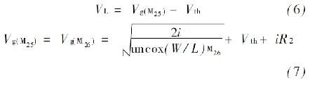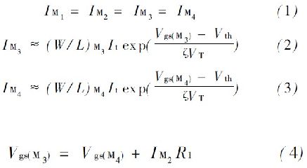 式中: K = (W/ L ) M4 / ( W/ L ) M3 ,通過式(5) 可以發現,偏置電流I M1 , I M2與輸入電源無關。