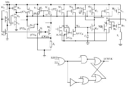 SE 為輔助振蕩器切換信號, SEB 為SE 的反信號。當V DD低于1. 9 V 時, SE 為高電平, M17 , M18 都截止, 不影響R, S 觸發器的翻轉, 輔助振蕩器工作, 開關S1 斷開, S2 閉合; 當VDD 高于1. 9 V 時, SE 為低電平, 輔助振蕩器關斷, 開關S1 閉合, S2 斷開, M17 , M18 都導通, R=1, S= 0, AU XCLK 被鎖定為高電平, 既減小了功耗, 也避免了輔助振蕩器關斷之后R, S 端出現不確定狀態。