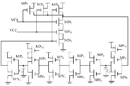 本文所設計的主振蕩器采用如圖2 所示的環形振蕩器結構。VC1, VC2 分別為過壓保護電路, PWM 比較器的輸出信號, MP10和MP11 為帶隙基準提供的鏡像電流, 合理的控制鏡像電流和電容C1 , C2 的大小, 即能夠使主振蕩器在1. 9~ 8 V 的V DD區間輸出350 kHz 左右較穩定的振蕩頻率。