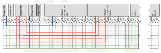 可以選擇另一種方式對矩陣進行配置,這種方式可以得到更為高效,并且Pickering公司的BRIC也非常適用在這種方式中。前面提到的矩陣構成方式是,將測試裝置和Y向進行連接,將待測設備的接入點和X向進行連接,下面我們采用另一種方式重新對矩陣進行排列,將所有的測試裝置以及待測設備的接入點都和X軸向進行連接。而Y軸則是將X軸方向上的不同設備進行相互連接。盡管在許多應用中,如果PXI的前面板上有需要的話,Y軸是可用的,但是Y軸的輸出并沒有用到。