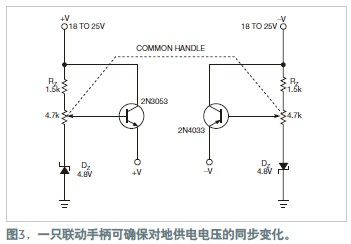 由于晶體管的基-集電極反偏擊穿電壓各不相同,因此電路提供了一種改變電源電壓的簡單方式(圖3)。隨著電壓的升高,與發射極連接的兩只LED都發光,而集電極只有一個LED發光(圖2中b和d)。±4V的基本電壓足夠用于檢測晶體管的基極或類型。如將電源電壓從±4V增至±15V,就可以測試很多種晶體管的發射極。考慮到串聯LED的壓降,這個范圍可為基射結提供最高26V以上的反向擊穿電壓。