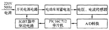 目前,電動車電池作為一種儲能裝置,主要以鉛酸蓄電池為主,充電器是專門針對鉛酸蓄電池所設(shè)計的。傳統(tǒng)的蓄電池充電器采用電流/電壓負(fù)反饋的方法來達到恒流/恒壓充電的目的,為了實現(xiàn)充電過程各種工作參量的實時監(jiān)測及智能多段式充電策略的精確控制,引入電流/電壓反饋環(huán),應(yīng)用P IC16C712 單片機及相應(yīng)的控制電路,其硬件結(jié)構(gòu)框圖如圖1所示,電路圖如圖2所示。