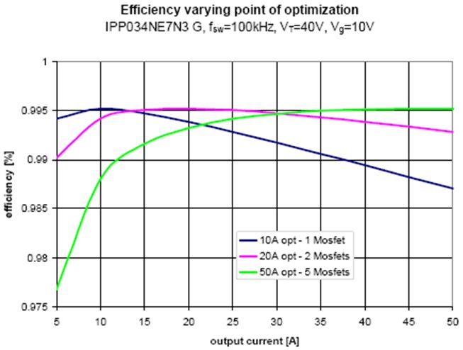 為闡明這個問題,圖4顯示了不同優化方法得到的效率。圖中所示效率曲線為,當變壓器電壓為40V、柵極驅動電壓為10V、開關頻率為100kHz時計算得到的12V同步整流級的效率。在75V優化表中選擇 IPP034NE7N3,按10 A MOSFET電流進行設計,所得到的優化方案僅需一個MOSFET。如圖4所示,這種優化方案能夠在低電流時實現很高的效率,而在高電流時效率卻極低。按50 A進行優化設計,所得到的最佳方案則需要5個MOSFET。采用這種優化方案,低電流時的效率將低得不能接受,但在滿負載時可以達到最高效率。因此,對該設置而言,最佳優化方案是采用兩個并聯的MOSFET,從而獲得整體均衡的效率。