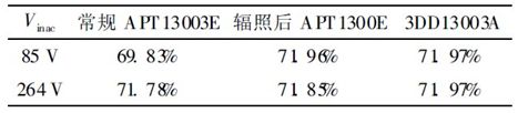 表3是AP3765序列充電器中采用經過10 kGy電子輻照的APT13003E 及3DD13003A 在85 V 和230 V 輸入電壓下輸出負載電流分別是0. 15 A、0.30 A、0. 45 A、0. 60 A 系統平均效率的結果。從表3中可以看出, 10 kGy電子輻照后的APT13003E的效率與3DD13003A 的效率基本相同。
