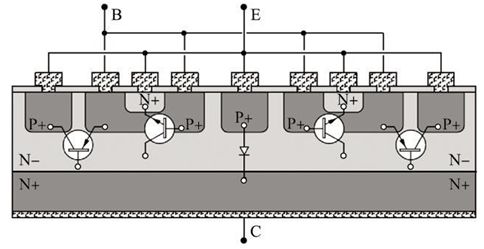 采用鉗位型開關晶體管也能降低開關晶體管的關斷延時, 其原理是通過鉗位電路使VBC在晶體管導通時不能增加到深飽和所需的0. 7 V, 這樣注入集電結兩側的少子很少, 使超量儲存電荷很少, 這樣儲存時間大大縮短。采用鉗位型開關晶體管主要有兩種, 一種是在集電結并聯肖特基二極管的晶體管,由于在高溫下漏電電流較大, 其ts - Vcesat的Trade??o ff關系最差, 目前應用較少。另一種是橫向PNP鉗位型晶體管, 其結構圖如圖6所示, 它在高溫下漏電較小, 能得到較好的Trade-off關系,電流放大系數基本不變, 目前得到了越來越多的應用, 如吉林華微電子股份有限公司研發的產品3DD13003A 就采用了這種結構。