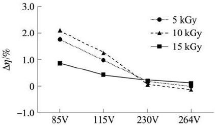 圖3 電子輻照后的APT13003E與常規的APT13003E在各個交流輸入電壓下系統平均效率增加百分比[page]