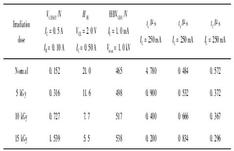 從表1中我們可以看到, 經過輻照后, 儲存時間ts 隨著輻照劑量的增大有很大幅度的減小, 下降時間tf 有所減小, 上升時間tr 有所增加; 電流放大系數隨著輻照劑量的增加而下降; 飽和壓降和擊穿電壓HBVceo隨輻照劑量的增大而增大。