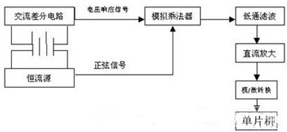 為了解決上述各方法的缺陷,本文采用了四端子測(cè)量方式,將蓄電池兩端上的電壓響應(yīng)信號(hào)通過(guò)交流差分電路與產(chǎn)生恒定交流源的正弦信號(hào)經(jīng)過(guò)模擬乘法器相乘,再將模擬乘法器的輸出電壓信號(hào)通過(guò)濾波電路,使交流信號(hào)轉(zhuǎn)變?yōu)橹绷餍盘?hào),直流信號(hào)經(jīng)直流放大器放大后進(jìn)行模數(shù)轉(zhuǎn)換,將轉(zhuǎn)換后的值送入單片機(jī)進(jìn)行簡(jiǎn)單處理。
