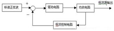 電路組成框圖如圖2所示:這是一個(gè)閉環(huán)控制系統(tǒng),電流負(fù)反饋電路。標(biāo)準(zhǔn)正弦波產(chǎn)生一個(gè)頻率穩(wěn)定、對(duì)稱(chēng)、失真度低的1KHz正弦波信號(hào)。驅(qū)動(dòng)電路把正弦波放大,去推動(dòng)功放電路,得到正弦交流電流輸出。恒流控制電路從功放輸出中得到的信號(hào),通過(guò)與給定的信號(hào)相比較,來(lái)調(diào)節(jié)驅(qū)動(dòng)電路的信號(hào),從而使輸出電流保持穩(wěn)定。