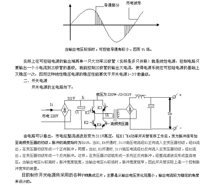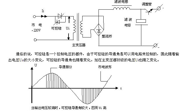 也就是~220V市電經可控硅控制后只有一部分加在主變壓器的初級。當輸出電壓Uo較高時,可控硅導通角較大,大部分市電電壓被可控硅“放過來了”(如上圖所示),因而加在變壓器初級的電壓,即Ui較高,這當然經整流濾波后輸出電壓也就比較高了。