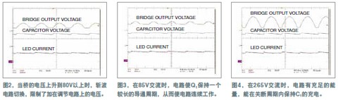 圖4顯示的是輸入電壓為265V交流時電路的工作情況。軌跡1表明,由于其輸入電壓高,Q1導通時間短。而軌跡2則顯示仍保持有充足的能量給Q1充電,在關斷周期內也能維持通過LED的電流。