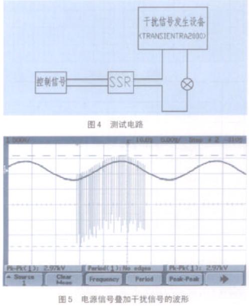 圖4 所示為測試電路。對SSR 來說,有信號源(穩壓電源)、小于1 米的連線、負載及有關儀器;圖5 為電源信號疊加干擾信號的波形。