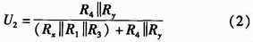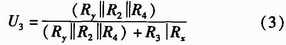 如圖2所示,U+和U-為被測線路的母線供電電壓,正常工作時(shí)兩母線間的電壓差Ux+y為440 V,且隨蓄電池內(nèi)阻變化。Rx,Ry分別為被測線路的正母線絕緣電阻和負(fù)母線絕緣電阻。正、負(fù)母線絕緣電阻反映的是64路的正、負(fù)支路的總體絕緣性能,等效于各個(gè)支路的正、負(fù)絕緣電阻的并聯(lián),正常時(shí)兩母線絕緣電阻>20 kΩ。Ux和Uy為正負(fù)母線對地電壓,大小隨正負(fù)母線的絕緣電阻變化,但兩母線電壓差恒定為Ux+y。為了檢測正負(fù)母線電壓Ux,Uy,Rx,Ry,系統(tǒng)采用了“平衡-不平衡檢測法”檢測母線電壓和母線絕緣電阻。計(jì)算公式如式(1)所示。