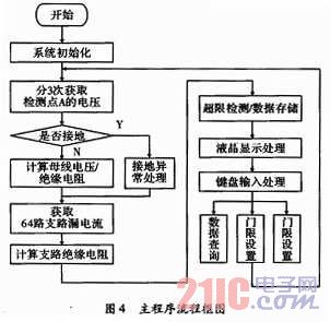 整個(gè)程序的編寫均由C語言完成,在程序設(shè)計(jì)中,采用了結(jié)構(gòu)化程序設(shè)計(jì)方法,使各個(gè)模塊程序相對獨(dú)立,便于程序代碼的維護(hù)、移植和升級。同時(shí),這樣分離式的程序設(shè)計(jì),降低了代碼的調(diào)試難度,縮短了調(diào)試周期。將與接地故障信息(如母線電壓,母線絕緣電阻,支路絕緣電阻,接地支路號(hào)等)密切相關(guān)的數(shù)據(jù)放在一個(gè)結(jié)構(gòu)體里,便于掉電存儲(chǔ)與回放顯示。系統(tǒng)的主程序流程圖,如圖4所示。