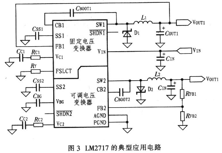 圖3所示是LM2717的典型應(yīng)用電路。圖中,VIN是整個(gè)應(yīng)用電路的電壓輸入端,VOUT1是固定降壓變換器的電壓輸出端,VOUT2是可調(diào)降壓變換器的電壓輸出端。CIN、Coot、CSS、CBOOT、L分別是輸入電容器、輸出電容器、軟啟動(dòng)電容器、自舉電容器、電感,這幾個(gè)元件在設(shè)計(jì)時(shí)應(yīng)著重考慮。這里主要介紹利用該電路進(jìn)行設(shè)計(jì)時(shí)一些主要外元件的選擇原則及需注意的問(wèn)題。