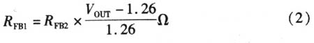 輸出電壓是依據(jù)反饋引腳和連接到輸出端的電阻分壓器設(shè)計(jì)的,如圖3所示。反饋引腳的電壓是1.26 V,因此根據(jù)式(2),由反饋電阻比來(lái)設(shè)計(jì)輸出電壓: