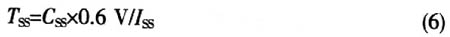 該器件無(wú)允許快速啟動(dòng)的內(nèi)部軟啟動(dòng),但是也會(huì)產(chǎn)生大的浪涌電流。因此,對(duì)于需要降低浪涌電流的應(yīng)用,該器件有限制DC/DC轉(zhuǎn)換調(diào)節(jié)器啟動(dòng)時(shí)浪涌電流的電路。浪涌電流限制電路可作為軟啟動(dòng)。外部的SS引腳用來(lái)調(diào)節(jié)軟啟動(dòng)的特殊應(yīng)用。電流ISS影響外部軟啟動(dòng)電容器CSS,軟啟動(dòng)時(shí)間計(jì)算為:
