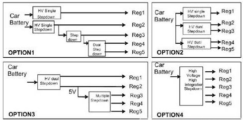 這里列出了四種常用的電源架構(gòu),總結(jié)了最近三年汽車領(lǐng)域的典型設(shè)計架構(gòu)。當(dāng)然,用戶可以通過不同方式實現(xiàn)具體的設(shè)計要求,多數(shù)方案可歸納為這四種結(jié)構(gòu)中的一種。