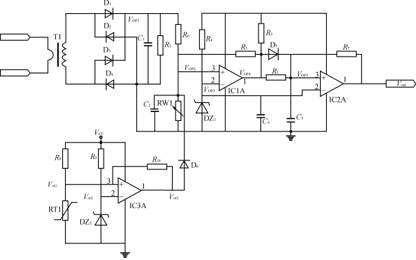 借助上述電路我們可以很容易地構(gòu)成,輸入過、欠壓保護,輸出過、欠壓保護,以及過熱保護。在此僅以附加過熱保護為例,說明如下:如圖1所示,過熱保護線路是由IC3A及其周邊元件組成。當(dāng)電源的溫度沒有超過設(shè)定溫度時,Vot1<Vot2,運放IC3A的輸出電壓Vot3為低電平,由于有二極管D6的存在,此時IC3A的輸出電壓Vot3不會影響到VOP2的電壓,也就是說在過熱保護線路未起作用時,它不會影響到上述的過流保護線路的性能。當(dāng)電源的溫度超溫時Vot1>Vot2,運放IC3A的輸出電壓Vot3變?yōu)楦唠娖剑ㄟ^二極管D6,使VOP2的電壓升高,從而觸發(fā)過流保護線路使電源進入停止工作期。只有當(dāng)電源溫度降低到超溫保護點以下時,電源才能重新進入正常工作狀態(tài)。依此類推可以構(gòu)成其它輸入輸出過、欠壓保護線路。在此不再贅述。