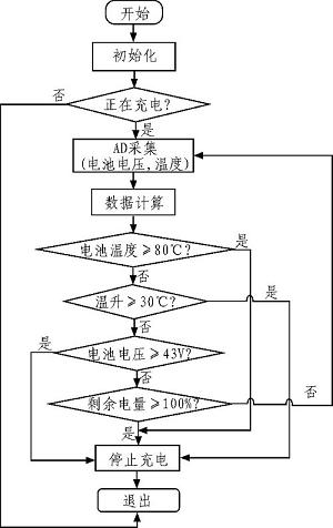 采用充電限壓,電池溫升檢測策略,如蓄電池電36 V,充電截止電壓42.5-43 V,充電截止溫度80℃,充電截止溫升30℃。不過絕大部分時間蓄電池基本處于欠充狀態。同時通過對電池電壓的數據實時采集,利用軟件控制對電池采取限壓保護:通過實時計算電池電量進行防過充過放保護,電量為100%時停止充電,電量為20%時停止放電,為延長其壽命,做了第二道防線。圖1 為蓄電池過充保護流程圖。