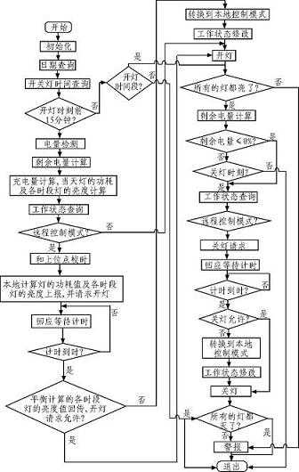 進行太陽能路燈電池板電流檢測,蓄電池電壓檢測,蓄電池電量監測,以及環境溫度的檢測,采用光開時關,并實時上傳工作環境及狀態數據,預警故障,保證系統的可靠性。圖2為太陽能路燈的開、關控制流程網。
