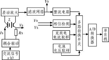 給電池施加一個固定頻率和固定電流(日前一般使用l kHz頻率、50 mA小電沆),然后對其電壓進行采樣,經過整流、濾波等一系列處理后通過運放電路計算出該電池的內阻值。圖4為在線測量剩余電量硬件框圖。