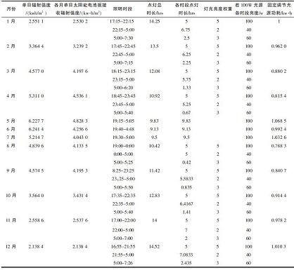 開關燈的時間根據天安門升降旗時間而定,如表1所示,全年最長點燈時長茌12月為14.52小時,最短為9.13小時。照明時間分為3個時段,第一個時段從當天天安門降旗時刻開始,為5個小時,第二個時段到早上5點,第三個時段從5點到滅安門升旗時刻,燈光亮度各時段權重比為5:2:3,如果以100 W光源為設計標準,則光源功耗最大為1.068 5 kW-h。