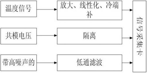 直接采集來的信號由于噪聲等原因不一定能夠滿足采集系統的要求,為了適合數據采集設備的輸入范圍,由傳感器生成的電信號必須經過處理。信號調理裝置能夠按照要求放大或者縮小電壓電流范圍,并對信號進行隔離濾波等處理。光伏監測系統的信號調理圖如圖3所示。