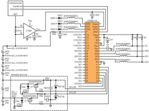 圖 1:6 節(jié)電池監(jiān)視系統(tǒng)的簡(jiǎn)化原理圖。LTC6803 測(cè)量電池電壓并