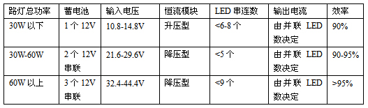 3.1 蓄電池只有幾種規定的電壓,12V是最常使用的,因為它是汽車電池的標準電壓。24V就需要用兩個串聯。36V就更少見了。為此,在太陽能LED路燈中經常需要采用升壓型的恒流驅動模塊。這就影響了恒流模塊的效率。