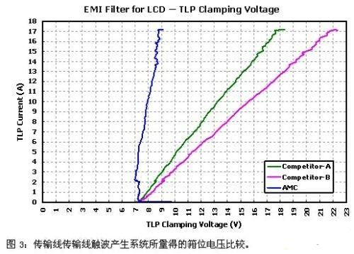 在靜電放電事件的高導通電流下,瞬時電壓抑制器的箝位電壓越低則越能適時地被導通,以使受保護電路免于遭受靜電放電的侵害而永久受損失效。圖3所示為利用傳輸線脈沖產(chǎn)生系統(tǒng)(TLP)所量得的箝位電壓比較圖。由圖中可以清楚看到,晶焱科技應用于液晶顯示器的電磁干擾濾波器,在17安培的高靜電放電電流下具有最低的箝位電壓,可以非常有效地提供受保護電路一個快速有效的靜電放電旁通路徑。