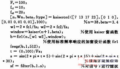 Matlab信號(hào)處理工具箱提供了各種窗函數(shù)、濾波器設(shè)計(jì)函數(shù)和濾波器實(shí)現(xiàn)函數(shù)。設(shè)計(jì)中利用Matlab提供的函數(shù)firl來實(shí)現(xiàn),編程則是直接調(diào)用這些函數(shù)簡(jiǎn)單直觀的完成設(shè)計(jì)。調(diào)用格式:firl(n,Wn,‘ftype’,Window),其中n為階數(shù)、Wn為截止頻率、ftype是濾波器的類型、Window是窗函數(shù)。應(yīng)用凱塞窗的代碼如下: