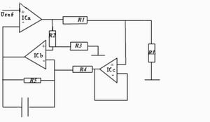 電壓-電流轉(zhuǎn)換模塊還有另外一種方案,即采用三個運放構(gòu)成輸出電流可變的電流源,如圖3所示。輸出電流I=Vi/R1,為使R1兩端的電壓保持恒定,由差分放大器IC1b通過射隨器IC1c監(jiān)測R1兩端的電位,此電位經(jīng)IC1b的7腳加到比較器 ICa的反相輸入端與Vref比較,根據(jù)比較結(jié)果使比較器的輸出端變化,直到平衡為止,即Vr1=Vi。電路中的電容用于補償ICa的頻率,減少控制環(huán)路的延時。只要R1=R2=R3=R4=R5,此電路的性能較好,但帶負(fù)載能力不強,環(huán)路延時補償對電路的穩(wěn)定有較大影響。