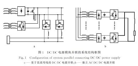 DC/DC電源并聯有兩種拓撲結構,一種是采用輸入直流母線結構,其系統結構框圖如圖1a所示,主要包括整流變壓器和不可控二極管整流電路,N 路DC/DC變換器,泵升電壓抑制電路等;另一種是采用獨立的AC-DC/DC電源并聯,系統結構圖如圖1b所示。