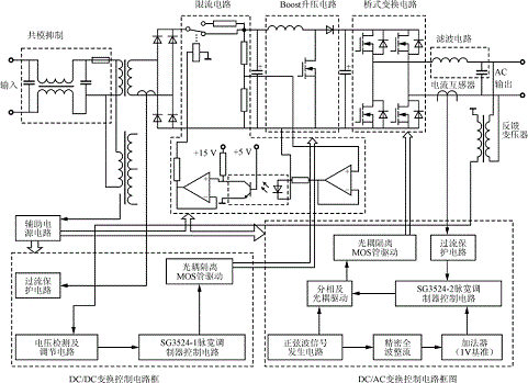 圖1示出了系統主電路和控制電路框圖。交流輸入電壓經過共模抑制環節后,再經工頻變壓器降壓,然后整流得到一個直流電壓,此電壓經過Boost電路進行升壓,在直流環上得到一個符合要求的直流電壓350V(50Hz/220V交流輸出時)。DC/AC變換采用全橋變換電路。為保證系統可靠運行,防止主電路對控制電路的干擾,采用主、控電路完全隔離的方法,即驅動信號用光耦隔離,反饋信號用變壓器隔離,輔助電源用變壓器隔離。過流保護電路采用電流互感器作為電流檢測元件,其具有足夠快的響應速度,能夠在MOS管允許的過流時間內將其關斷。