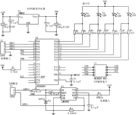 P89LPC932是由飛利浦生產的低功耗單片微處理器,電源電壓3.3V,可低功耗運行,適合于許多要求高集成度、低成本的場合。可以滿足多方面的性能要求。P89LPC932采用了高性能的處理器結構,指令執行時間只需2~4個時鐘周期,6倍于標準80C51器件。P89LPC932集成了許多系統級的功能,這樣可大大減少元件的數目、電路板的面積以及系統的成本,其內部有2個定時器,可作為一個具有256個定時器時鐘周期的PWM發生器使用。LED調光電路電氣原理圖如圖2所示。