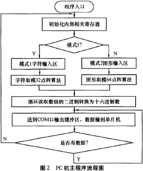 軟件采用實時的方式取模:數據圖形—數據。通過引入圖形這個中間量,使得提取字模變得靈活,無論任何字體、符號,都可以實現即時轉換。Pc機軟件主程序流程圖見圖2。