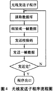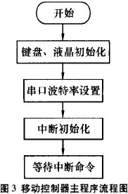 程序上電初始化后,處于等待狀態。當串口中斷一來I臨,優先處理串口中斷.發送無線數據是通過鍵盤、菜單控制。移動控制器主程序流程圖見圖3;無線發送子程序見圖4。