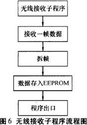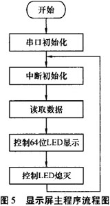 由單片機控制LED的亮滅和無線數據的接收.數據通過無線模塊接收后,單片機的串行接口收到數據并傳到主控芯片AT89S8252中處理,當有無線數據傳到時,優先處理接收數據.顯示屏主程序流程圖見圖5。無線數據接收子程序流程圖見圖6。顯示屏能否清晰顯示內容主要從以下幾方面考慮:1)單片機控制LED的亮滅時間:T=S/V,S為LED面寬度,為電機轉動線速度;2)電機轉動時軸心保持平衡;3)環境光線對比度。